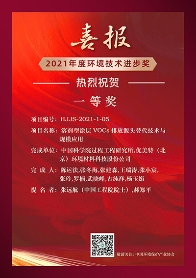 2022年初,中國環保產業協會正式對外揭曉2021年度環境技術進步獎結果,優美特“溶劑型涂層VOCs排放源頭替代技術與規模應用”項目,榮獲環境技術進步一等獎。