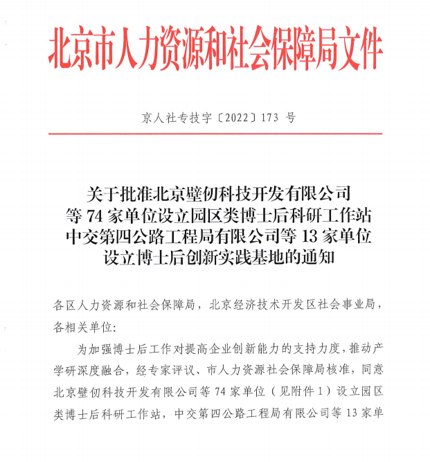 近日,北京市人力資源和社會保障局下發(fā)《關于批準北京壁仞科技開發(fā)有限公司等74家單位設立園區(qū)類博士后科研工作站中交第四公路工程局有限公司等 13 家單位設立博士后創(chuàng)新實踐基地的通知》(京人社專技字〔2022〕173號),優(yōu)美特(北京)環(huán)境材料科技股份公司(以下簡稱“優(yōu)美特公司”)獲批中關村科技園區(qū)順義園分站博士后工作站,標志著優(yōu)美特公司“人才強企、技術強企”環(huán)境營造創(chuàng)建邁向新的臺階。