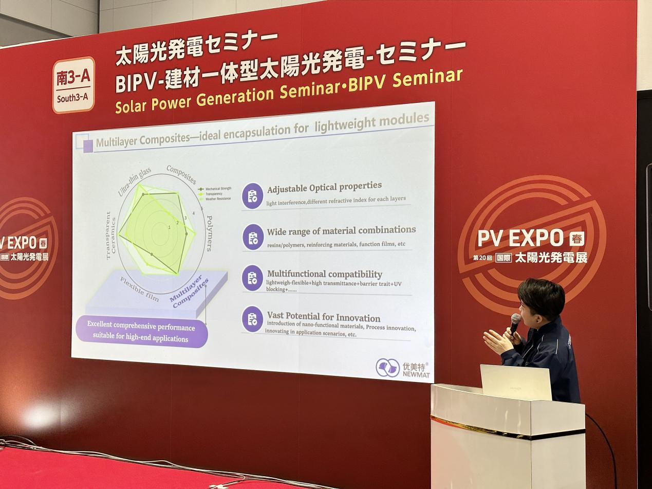 2025年2月19日至21日,優美特攜創新型彩色高透輕質前板和解決方案完美亮相2025日本東京國際智能能源周(World Smart Energy Week Tokyo)日本東京太陽能光伏展(PV EXPO)是亞洲地區規模最大、專業性最強的太陽能光伏展之一。是名副其實的太陽能行業盛會。